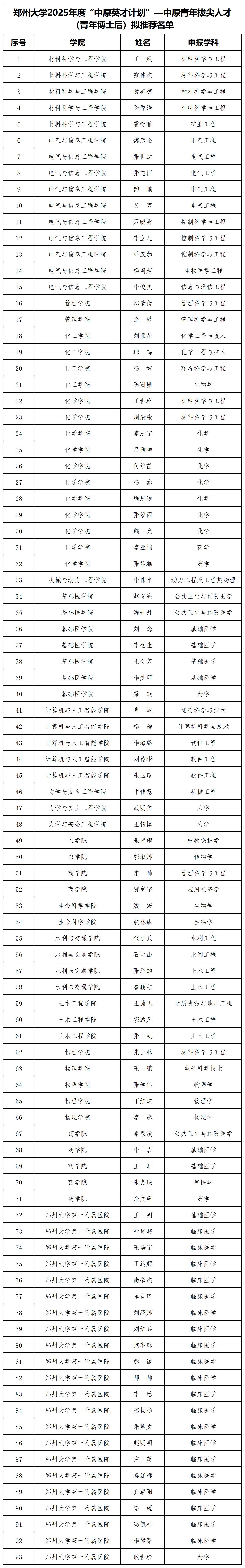 关于郑州大学2025年度“中原英才计划”—中原青年拔尖人才(青年博士后)拟推荐对象的公示
